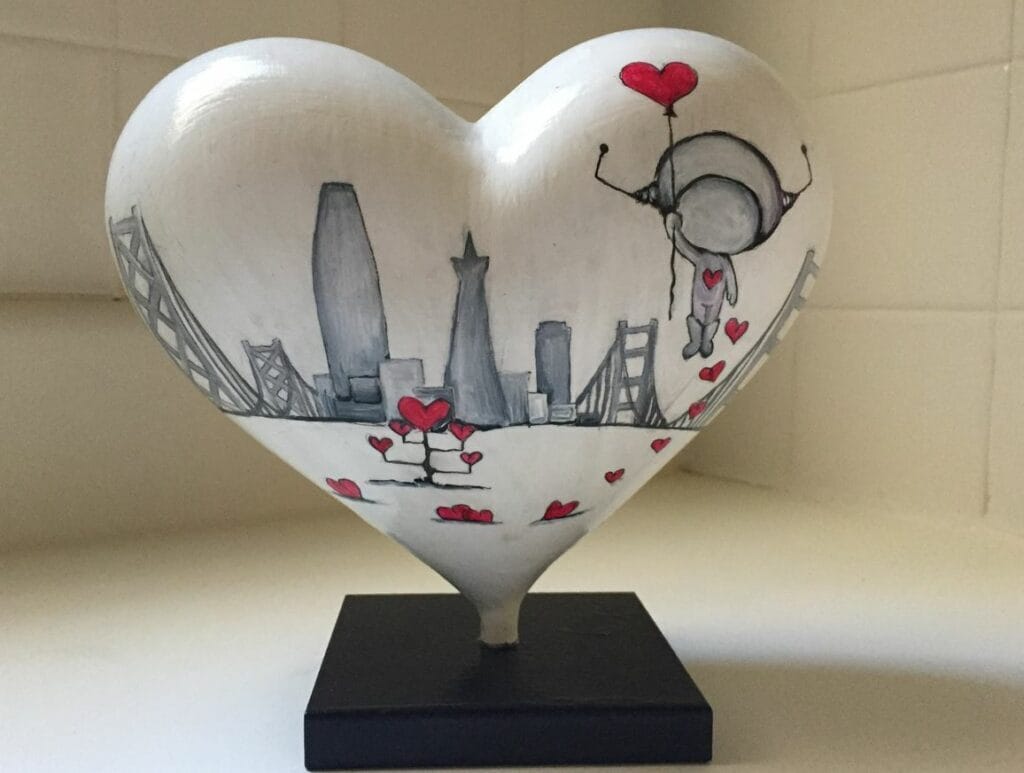 Darnel is a working artist in San Francisco and has lived in the city 25 years, you may recognize her illustrations from the SF Hearts she did in 2016 & 2019, and her three aliens illustrations which have been very popular around town.