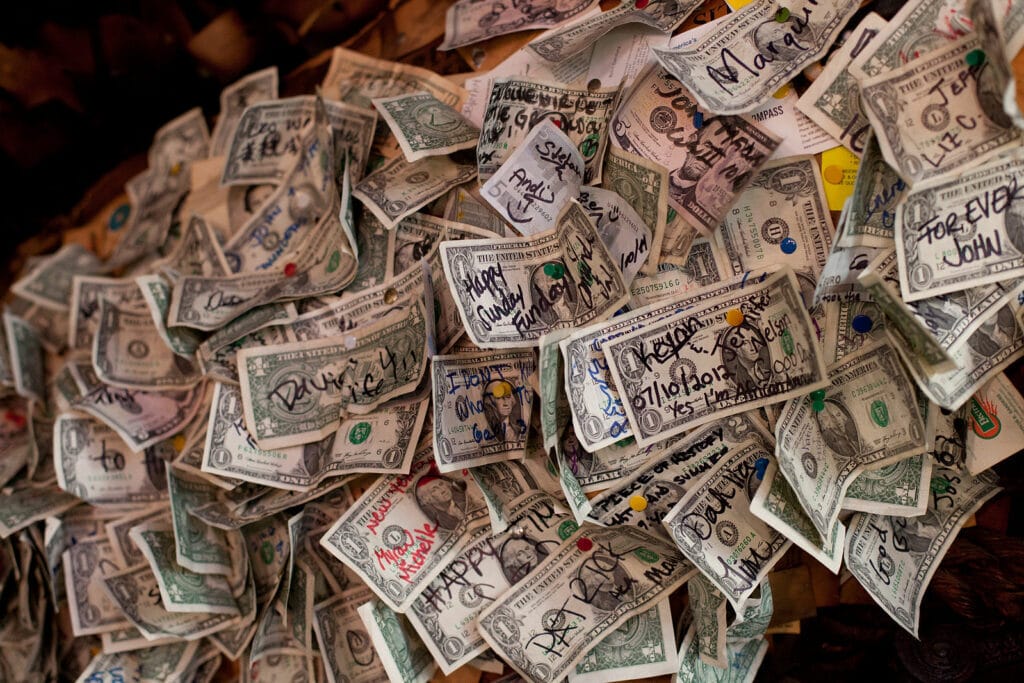 You’ll notice that there is money tacked to different parts of the interior. Back in the day, sailors would put their name on some money and leave it there so that when they got back to port they’d be able to retrieve their funds and cash it in for a drink. Nowadays, people have been stacking money there just for fun and to be part of this group art project of sorts. Reminds me of Grumpy’s Pub which is now permanently closed. They also were a sailor bar with a ceiling full of money.