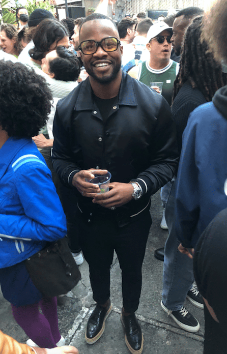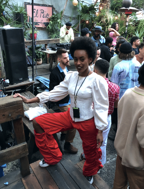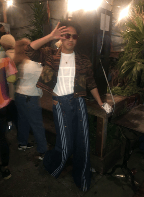 I brought my beloved Brandon Blackwood mini trunk bag along with me that night, and one of the drawbacks of participating in the mini and micro purse trend is not being able to properly put your phone away. That being said, it was beyond clear at this point that I needed to wipe my iPhone lens down with a soft cloth, but I digress because I ran into Arnold on the dancefloor. I couldn’t help but “rave” over his vintage JNCOs, something I haven’t seen in person since the first wave of their inception when I was in high school. Tall, statuesque, and brimming with positive, infectious energy, Arnold explained how his white corset bodysuit and cropped tapestry jacket were also thrifted.