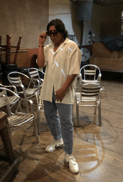 Speaking of Colombia and our clique (that grew in numbers as the sun started to go down)  we encountered Sam, who was giving very much 80’s Miami Colombian drug money heir with his ribbed, almost accordion pleated heavy handed** ivory button down from Zara, accented by throwback lowrider style Nike Cortezes, glittering gold jewelry and of the moment Gucci (or Gucci inspired? LOL literally who cares) sunglasses. A round of tequila shots later, the event had by then evolved into a totally different party.