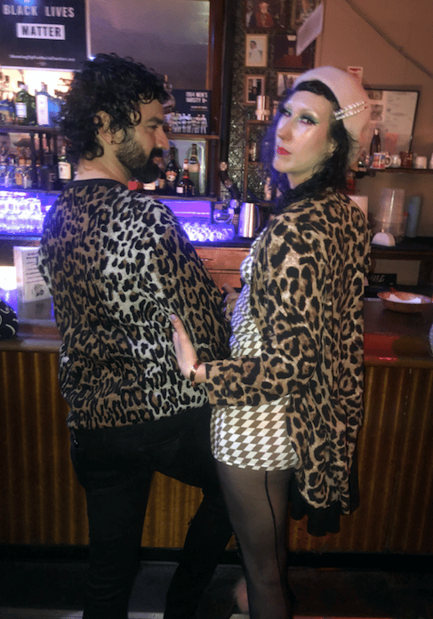 Never one to leave a good leopard print outfit uninterrogated, I stumbled upon the “jackpot” of double trouble Ademar and Alicia at the bar inside. Alicia, a friend of Editor in Chief Broke Ass Stuart was serving straight up High Femme with back seamed stockings and a pair of black satin platform heels with pink marabou feather and cascading rhinestones, which your author noticed because she also owns the same pair. Not to go unmentioned, Ademar was a vision of true Athleisure in his Stella McCartney pull over and flippy haircut that was just dying to be on a tennis court somewhere in Mill Valley.
