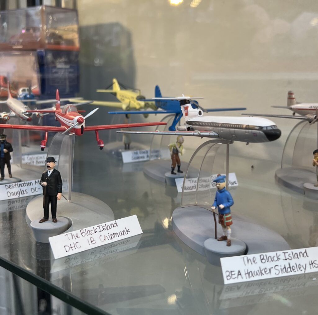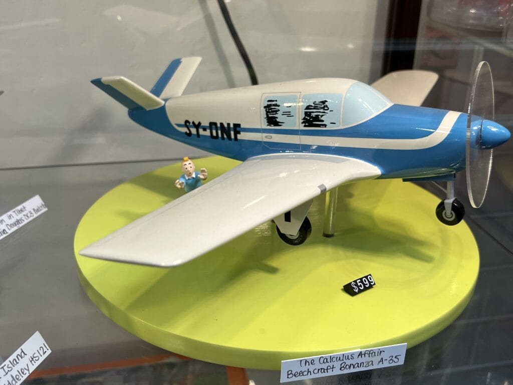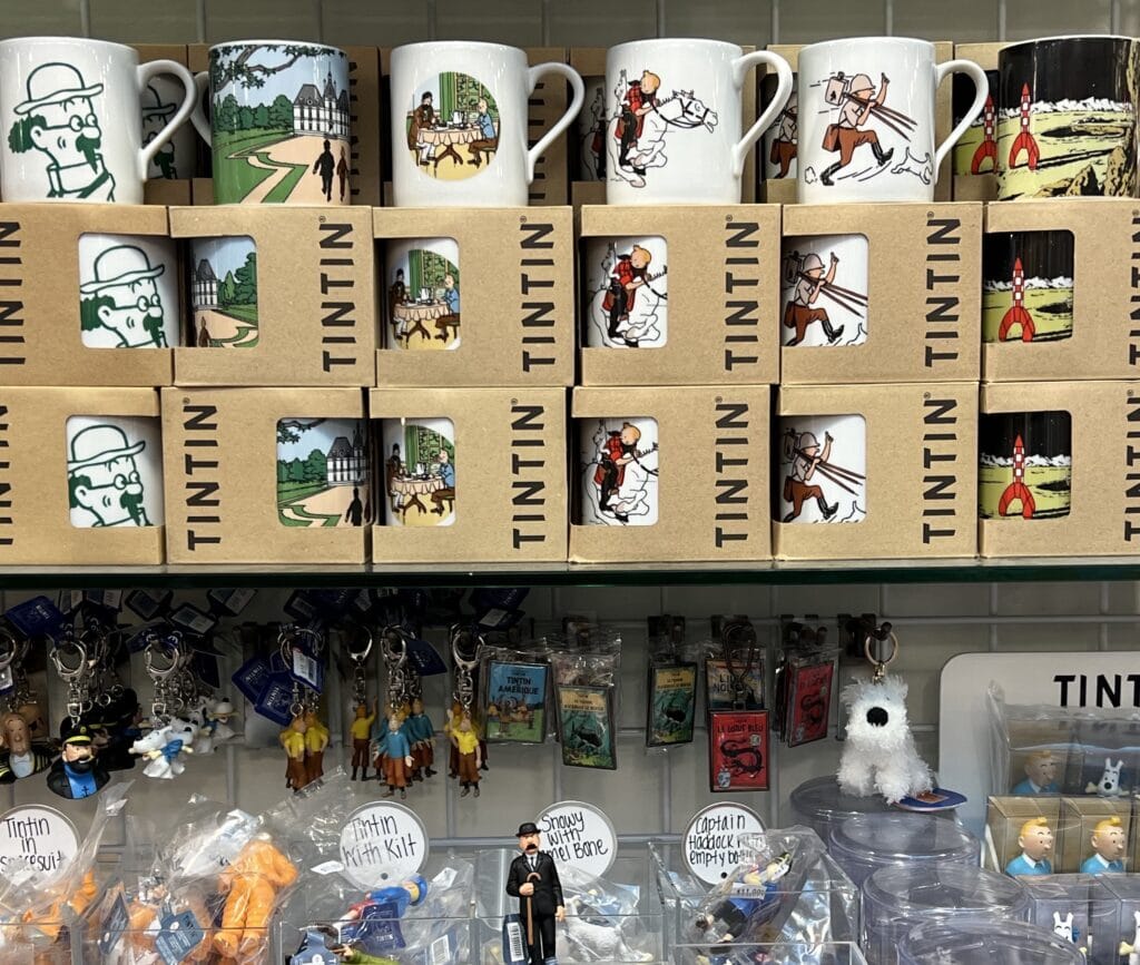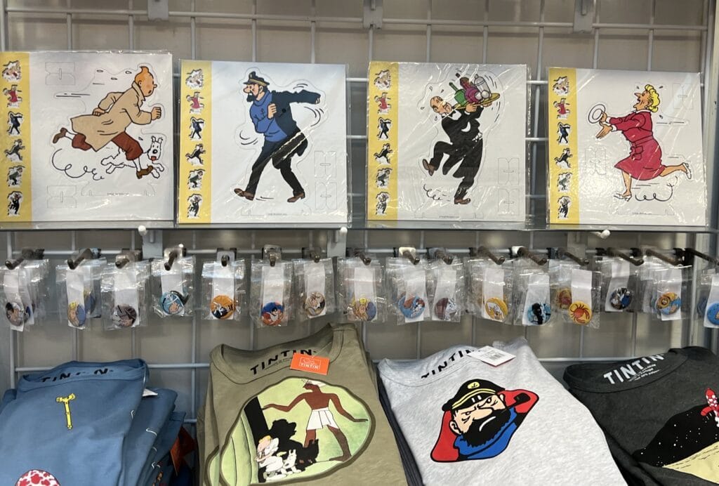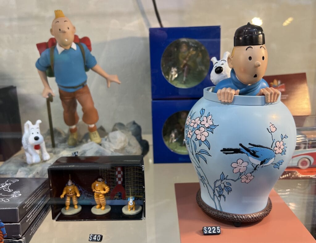 There’s truly a plethora of Tintin goods. All the Tintin adventures are compiled in book form, as one might expect, but there are also action figures of various sizes, statues of Tintin and the familiar characters in iconic positions, totes, keychains, posters, mugs, and a huge array of model planes and cars. The shop’s website takes the fandom further with historical Tintin blogs, a chance to sign up for “Tintin newsletter updates,” and has links to full episodes of old school Tintin cartoons.