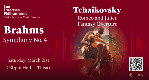 Join the San Francisco Philharmonic for a plunge into a night of passion, fate, and fire. Tchaikovsky’s Romeo and Juliet Fantasy Overture opens the concert with waves of emotion; based on Shakespeare's iconic play, it's a searing musical portrait of forbidden love and tragedy, in which tenderness collides with fate. After this tempest, the orchestra takes on Brahms’s towering Symphony No. 4 in E minor, a work of power and beauty. Its brooding themes and momentum drive toward one of the most epic finales in the symphonic repertoire. You won't want to miss this program, which falls fittingly on the first day of spring!