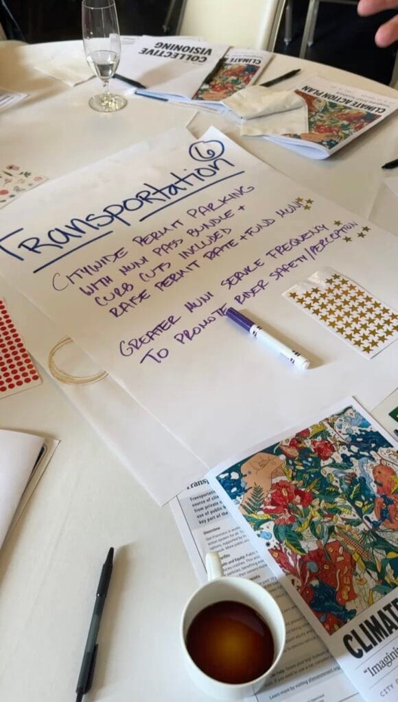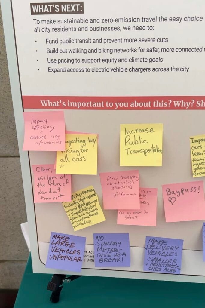 Muni is a clear answer; throughout the climate action planning session, funding and even extending public transportation options was written on several sticky notes and even on pre-printed materials brought by SF Environment. But Lurie’s comments muddied things a bit.